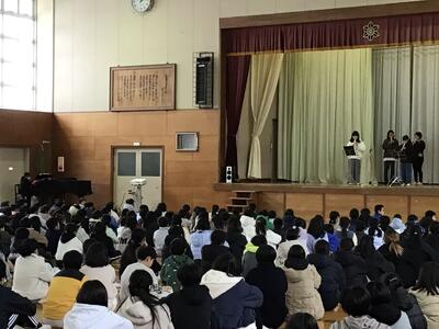 保健体育委員会からの2月の取組の提案の次に、3年生から「総合的な学習の時間」で学んだことの発表がありました。