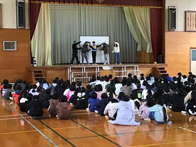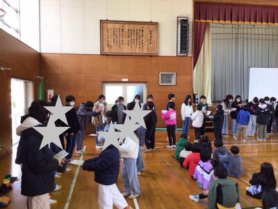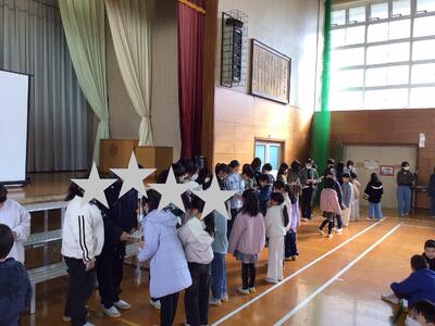 この後、6年生は教室に戻り、1〜5年生で歌と退場の場面の練習をしました。