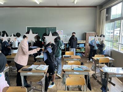 4月21日 3〜6年生 外国語の学習 投稿: 学校管理者 (17:56) 3〜6年生では、外国語の学習が始まっています。3・4年生は担任の先生ではない外国語活動担当の先生とALTの先生に教えてもらっています。 ALTの先生の発音を参考にして話しながら、外国語に慣れ親しんでいます。 5・6年生は、白糸中学校から来ていただいている英語専科の先生に教えてもらっています。 中学年での外国語活動の学習を土台にしながら、中学校へとつながる学習を進めています。 -