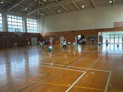 音楽に合わせてペースを考えたり、まっすぐ走ったりすることが少し難しそうでした。6年生に助けてもらいながら、自分の力を出し切れるといいですね。