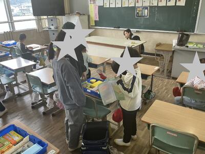 今朝、1年生教室をのぞいてみると、朝の準備の仕方を教えたり、一緒に楽しく会話したりする6年生の姿がありました。