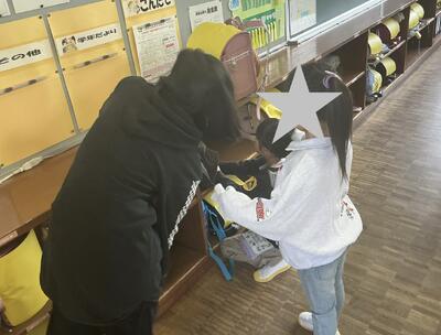 1年生は初めての学校生活にとまどう場面が少なくありません。そこで、6年生が最上級生として毎朝助けてに行っています。