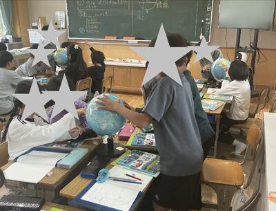 緯度と経度はどのようなものか、自分たちの住んでいるところは地球の中のどのあたりか、太平洋や大西洋の広さなどを確かめるために、地球儀をのぞき込んだり、指さして教えあったりしながら学習する5年生でした。